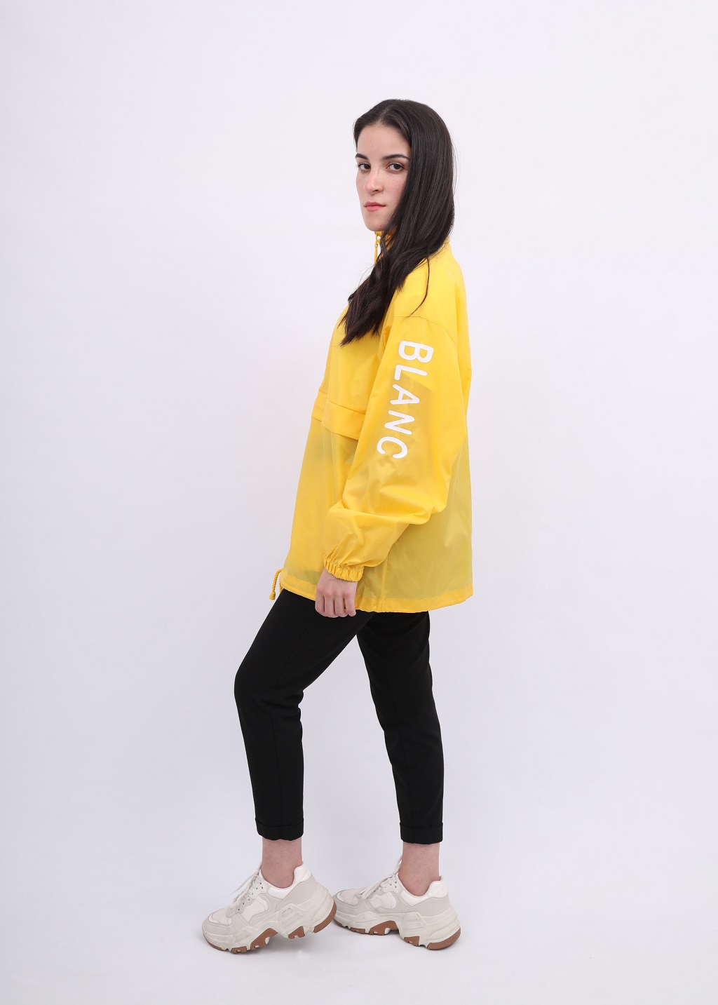Water repellent. Gola alta com carapuço escondido. Manga comprida acabada em punho elástico.