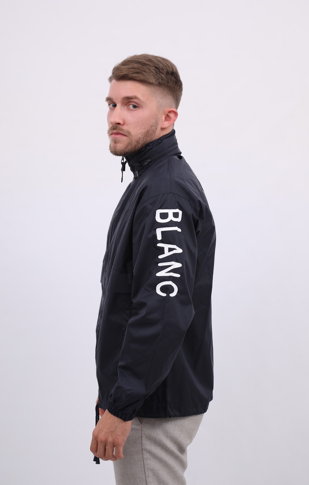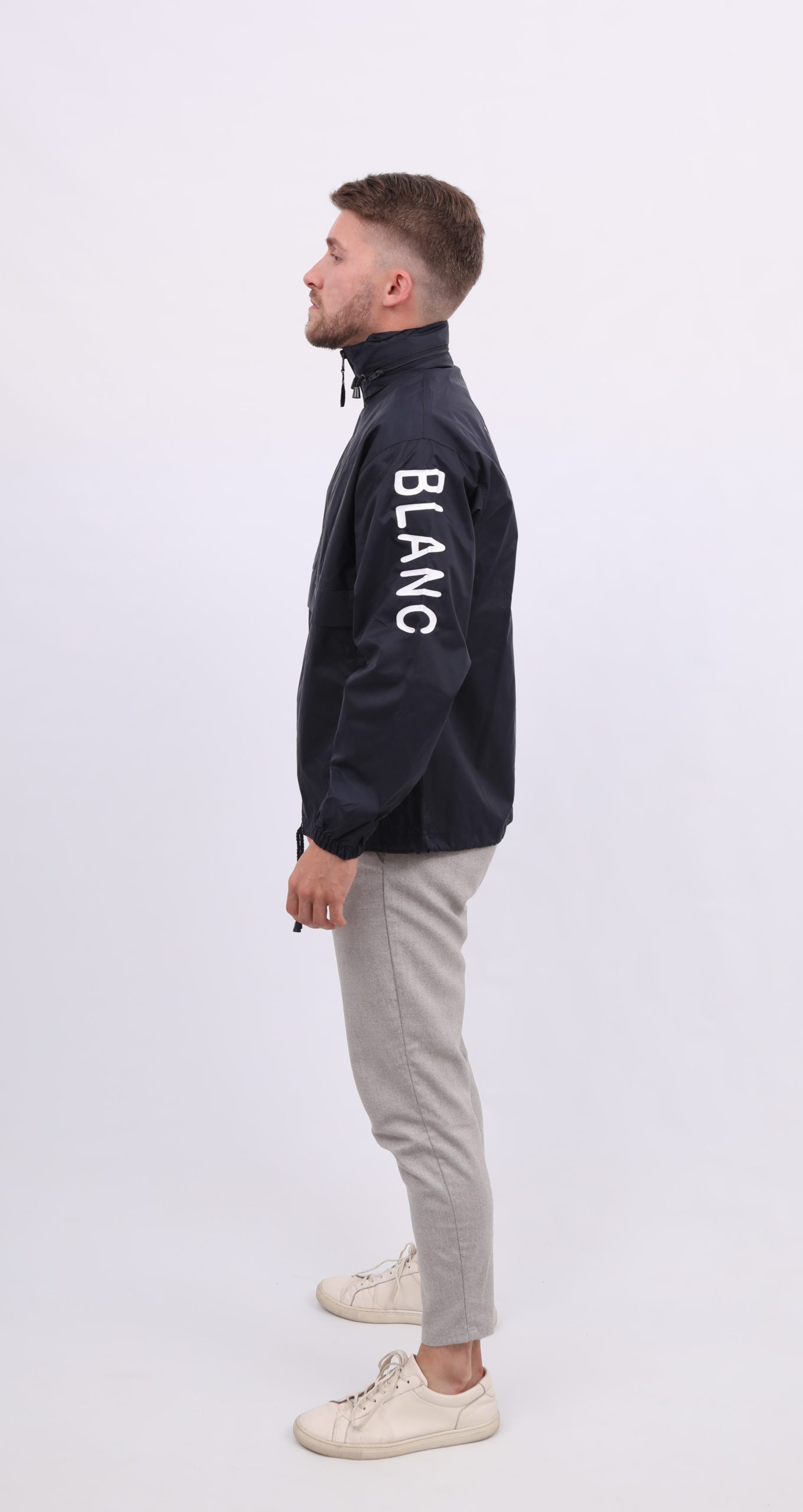 Water repellent. Gola alta com carapuço escondido. Manga comprida acabada em punho elástico.