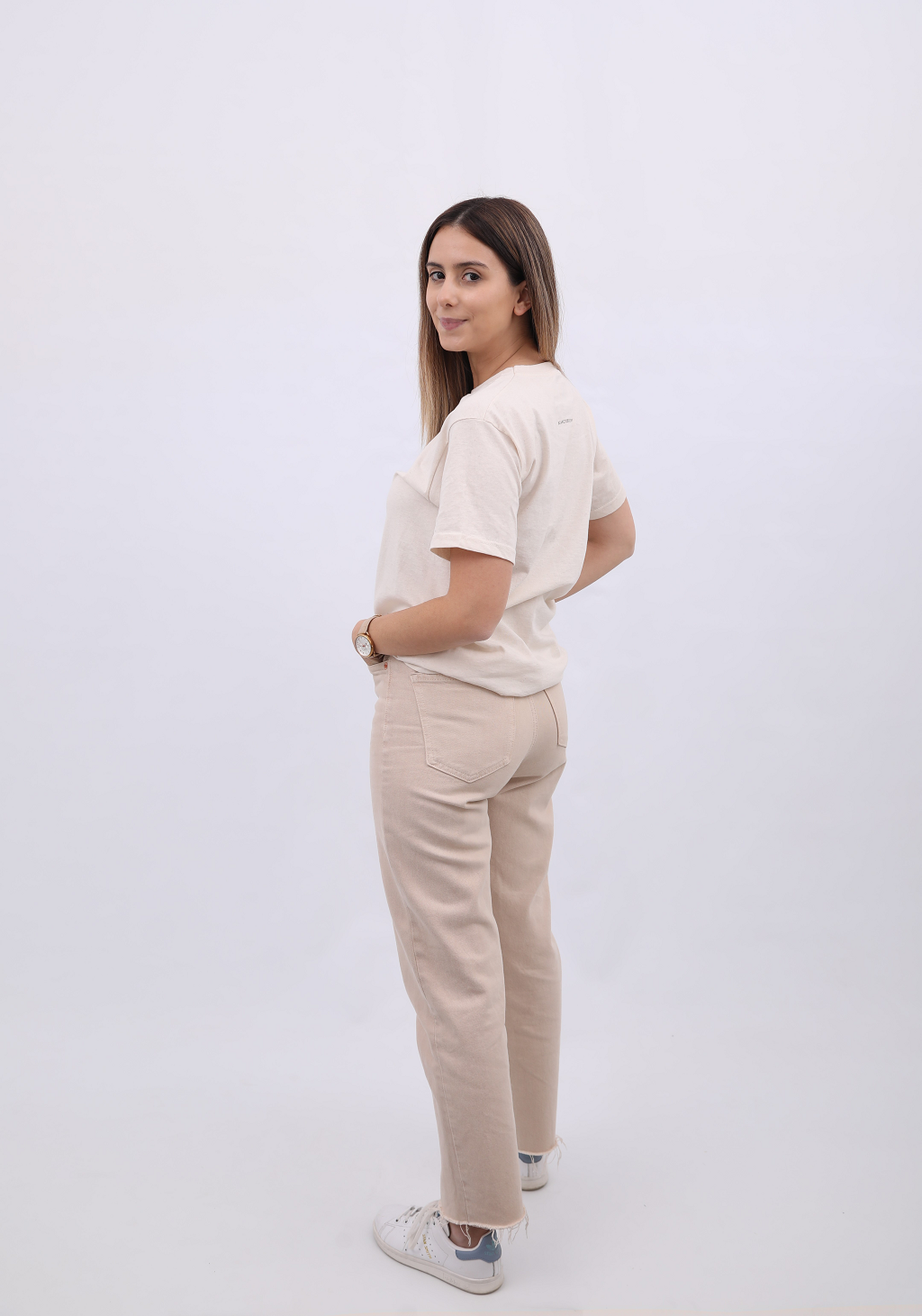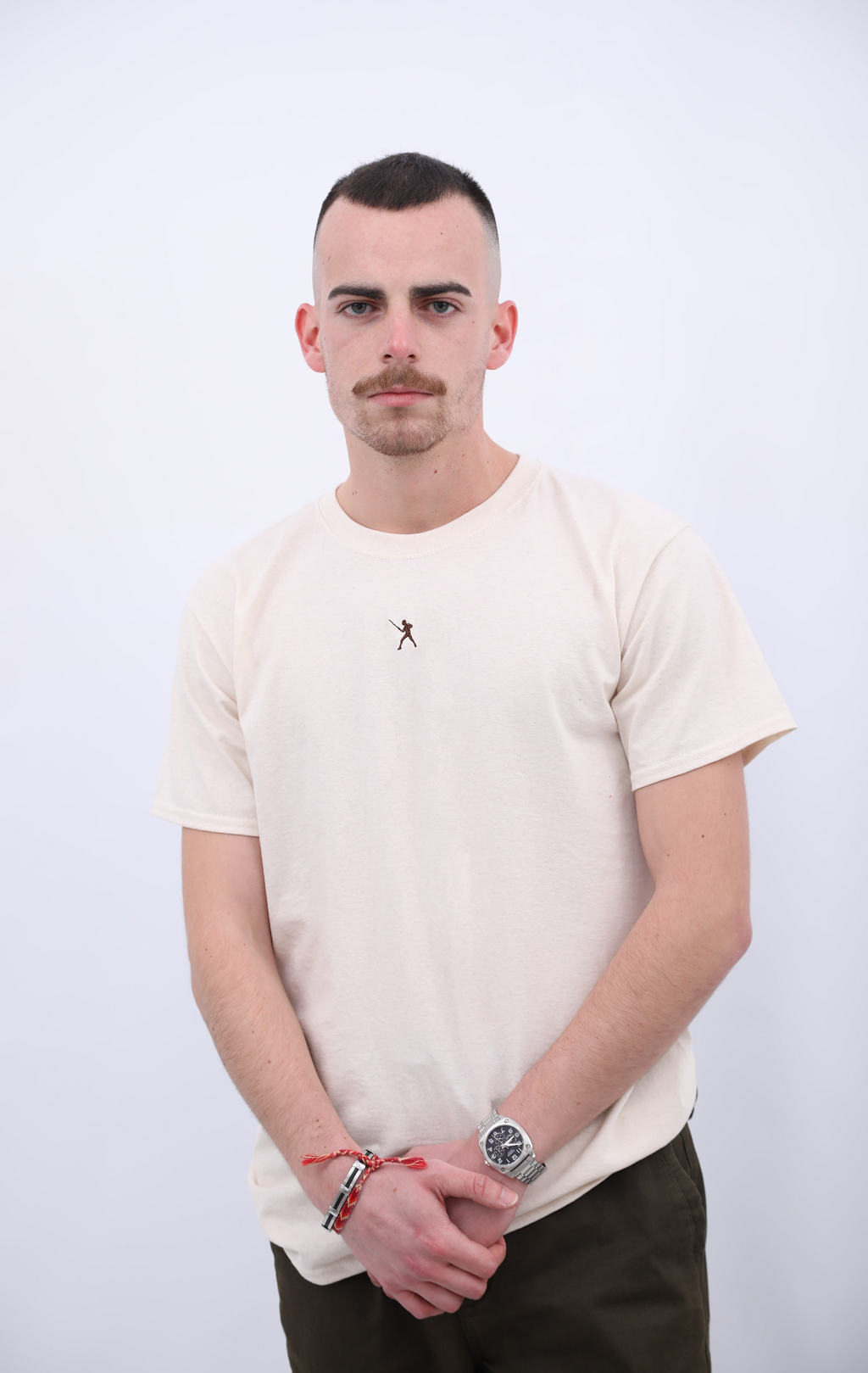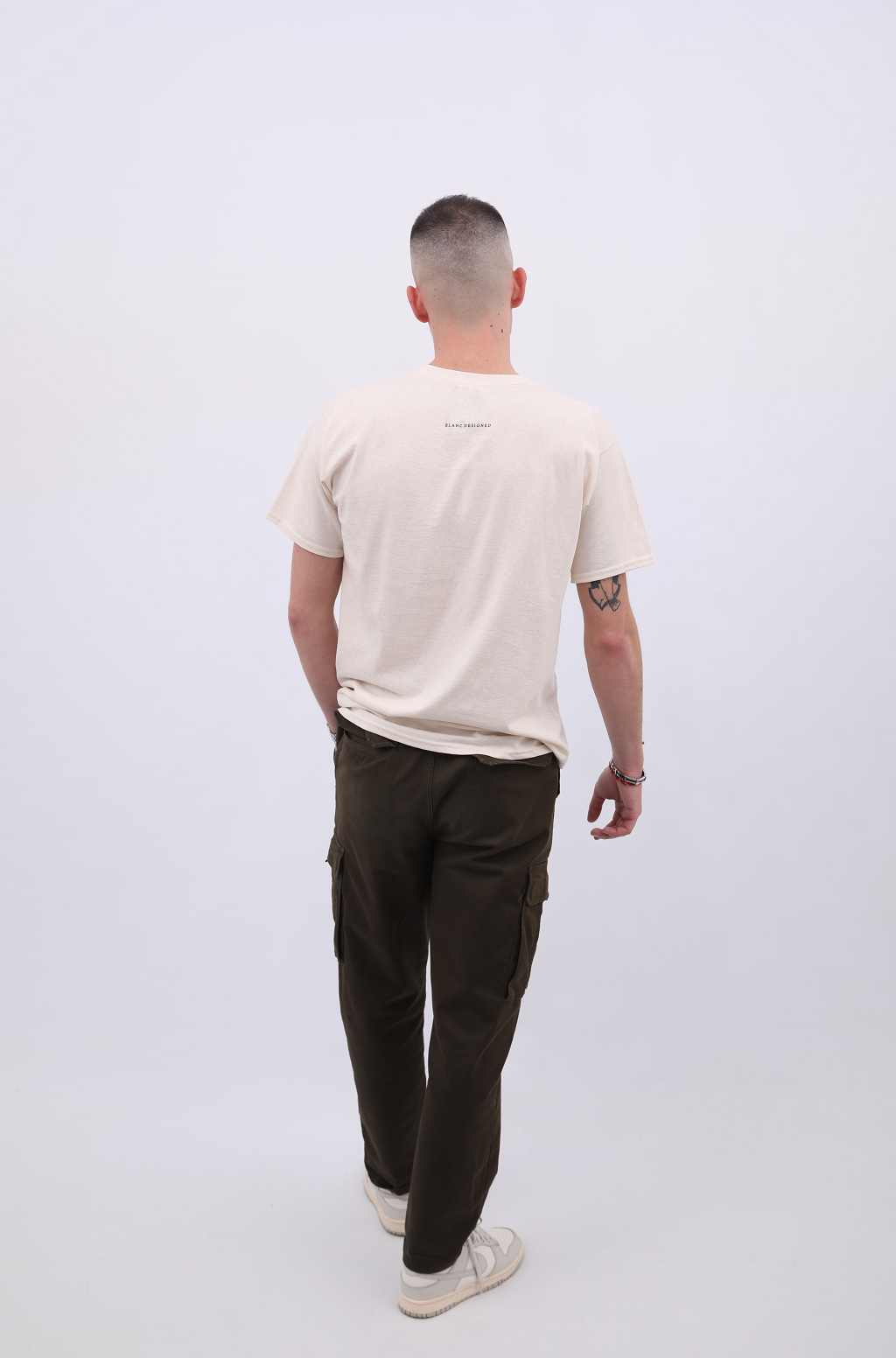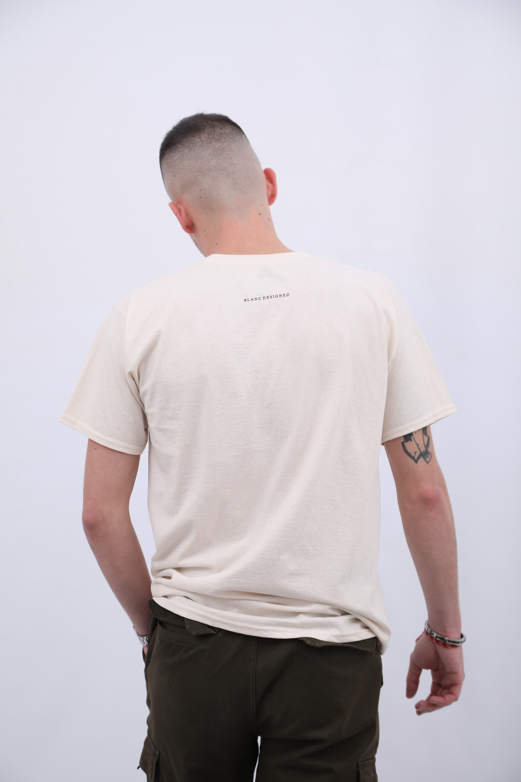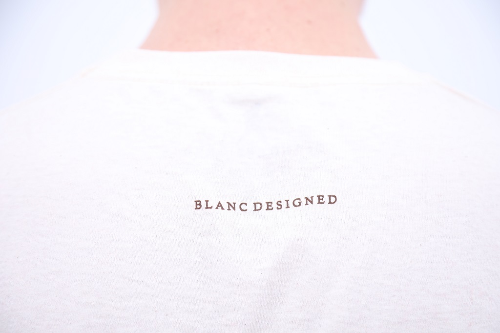 BLANC DESIGNED em serigrafia nas costas em castanho.