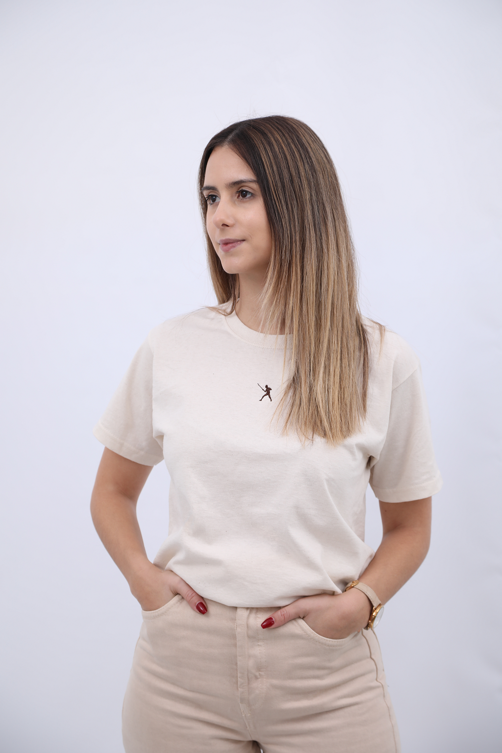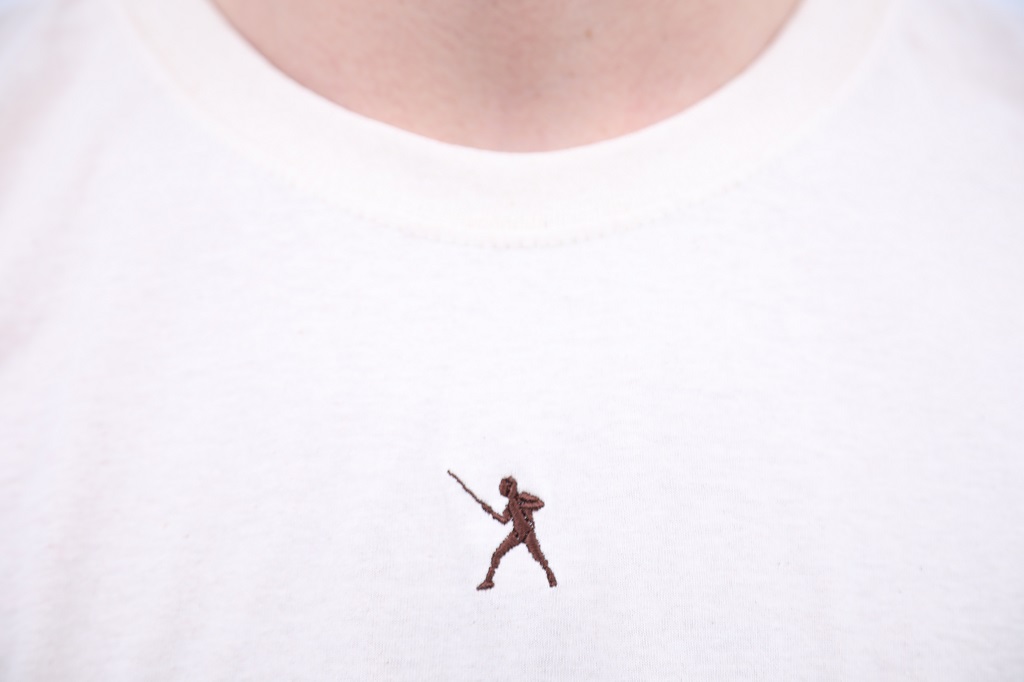 T-shirt com esgrimista bordado no peito em castanho.